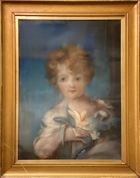 English Portrait of Child w Flowers. Pastel on Board. Unsigned.