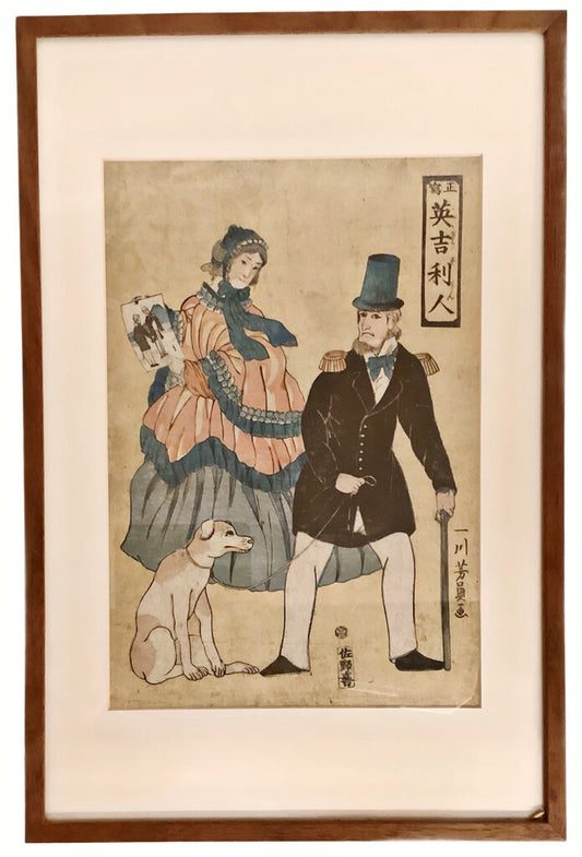 Utagawa Yoshikazu. "English Couple w. Dog". Woodblock Print; Ink & Color. 1861