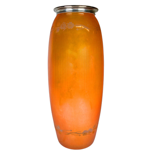 Hawkes & Co Orange Etched Phoenix Art Glass Vase w Sterling Rim