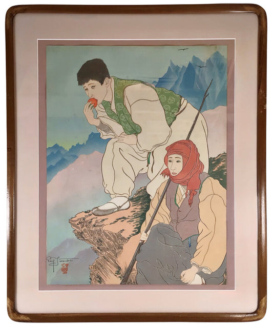 Paul Jacoulet. "Bergers des Hautes Montagnes Coree". Colored Woodblock Print. Signed Lower Left.
