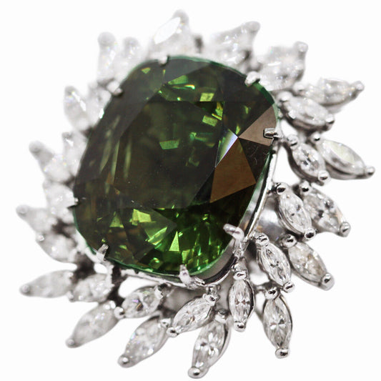 Exceptional 13.2 Carat Cushion Cut Green Chrysoberyl Ring w 32 Marquise Cut Diamonds Mounted in Platinum