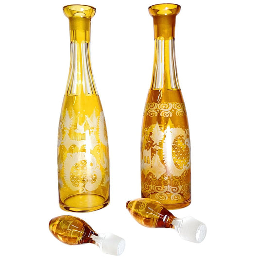 PAIR Antique Amber Bohemian Etched Glass Decanters