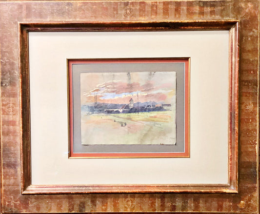 Sunset Landscape w/ Village, Mixed Media, 20th Century.