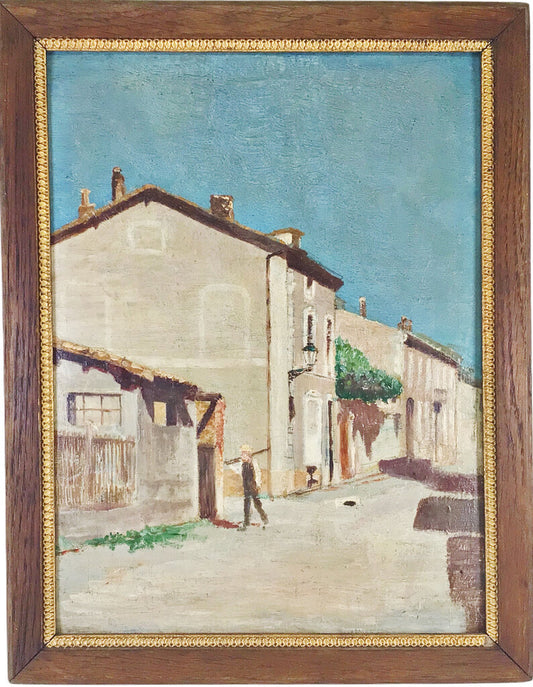 Man on French Village Street. Oil on Board.