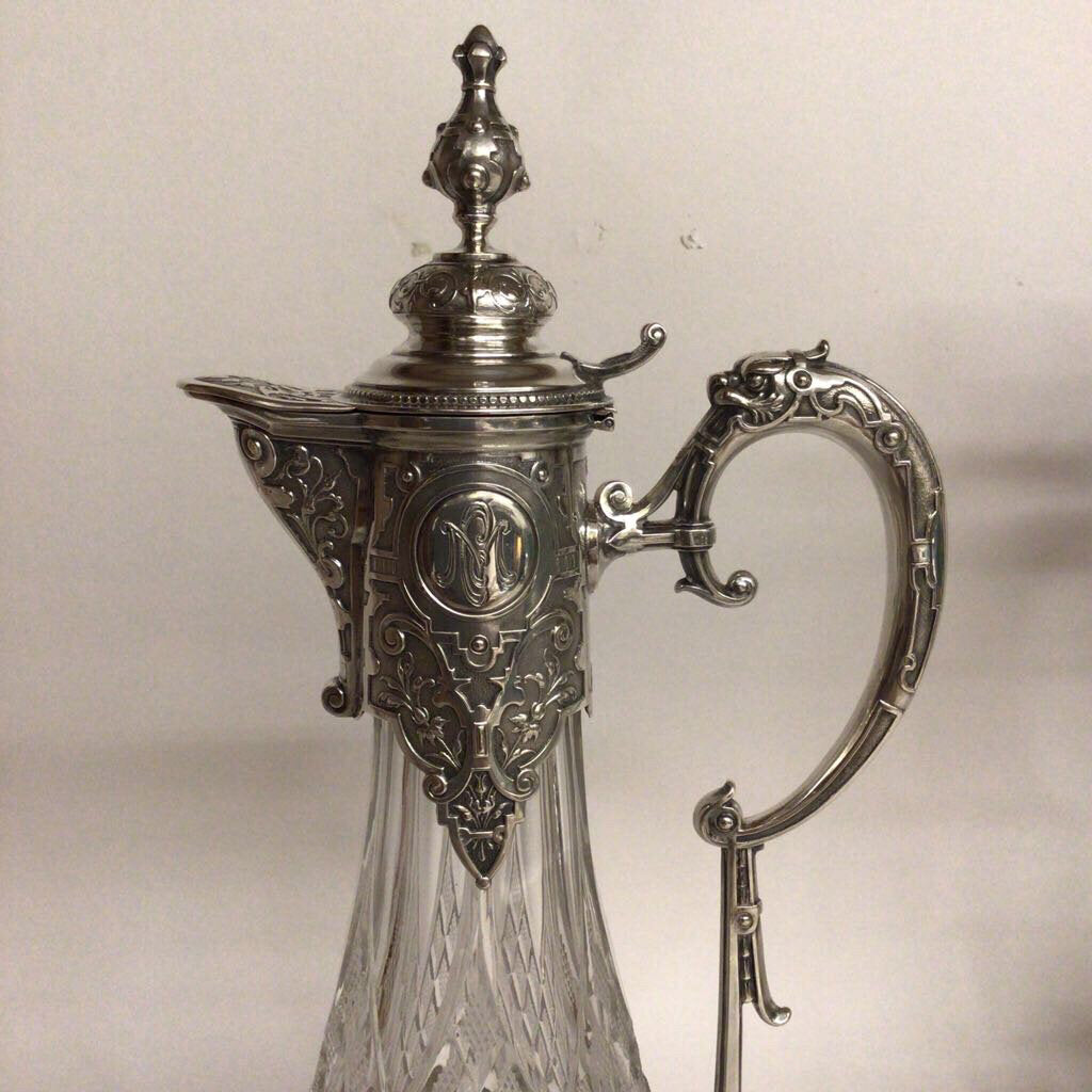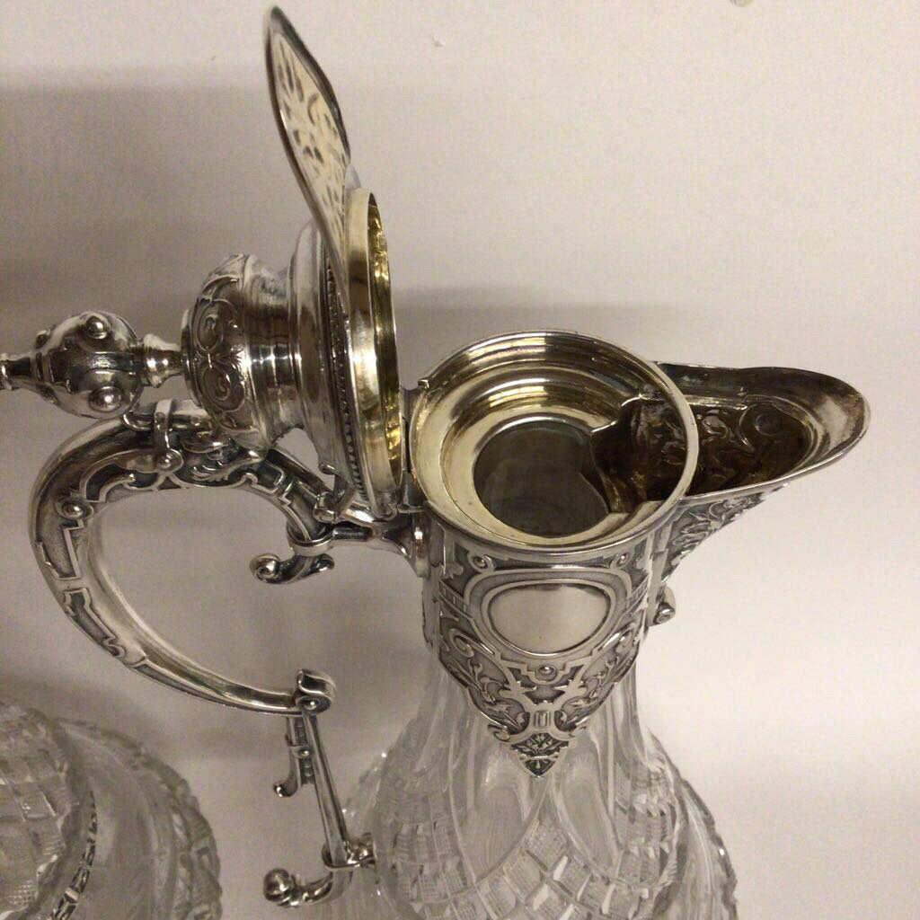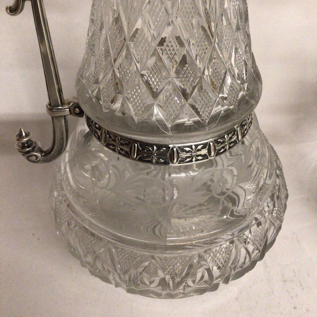 Pair of continental European cut & etched crystal ewers with mounted .800 silver fittings. Some scratches on base.