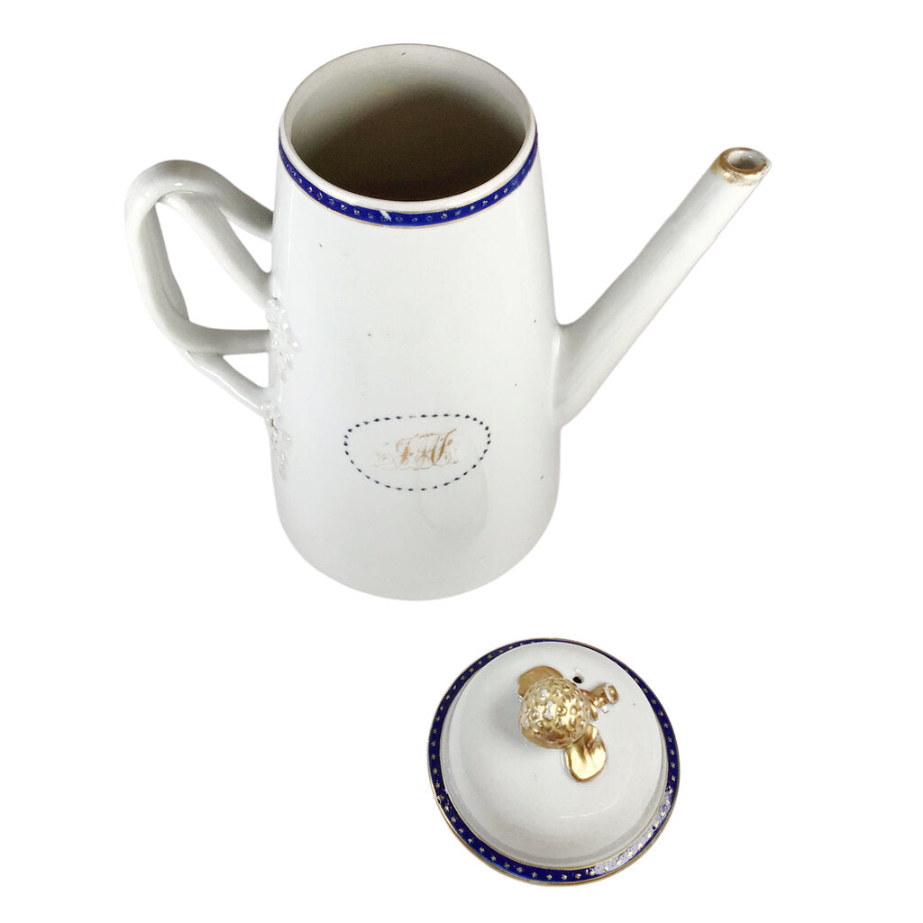 Chinese export lighthouse-type coffee pot in a neoclassical style, circa 1800. Monogrammed. Likely made for the American market.