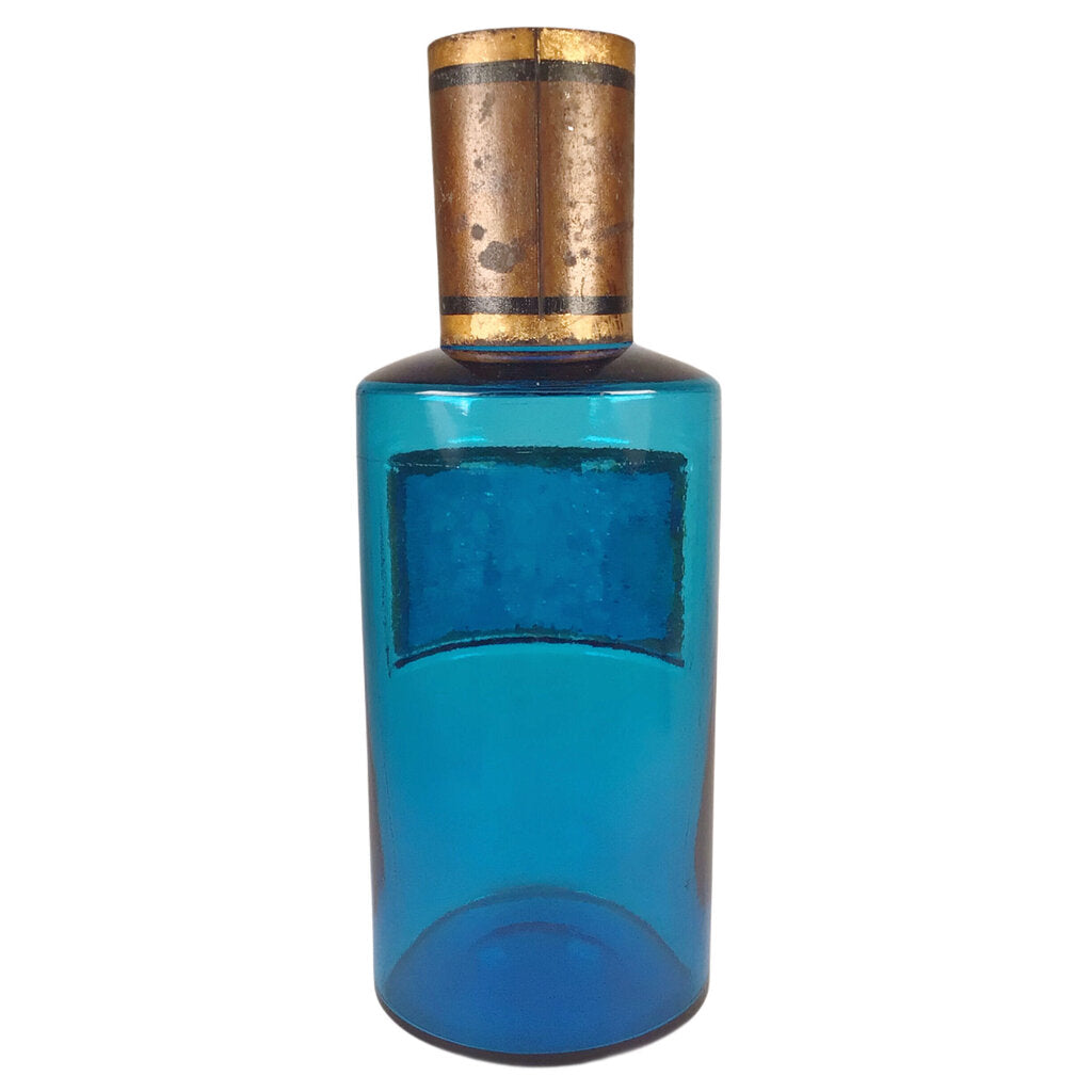 French Napoleon III pressed blue glass apothecary jar with tole peint lid and gilt porcelain label, ca. 1850-1875. Some wear to lid.