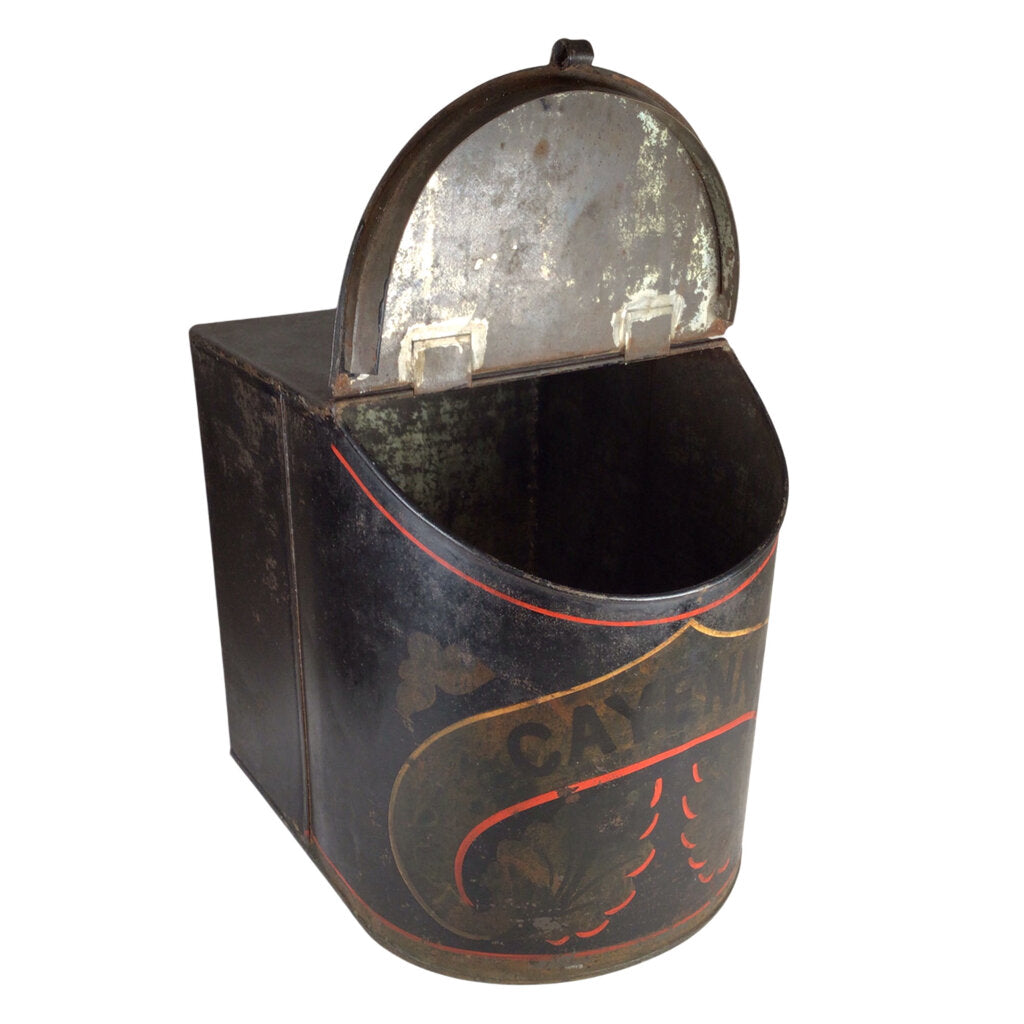 Pair of antique toleware general store spice bins with polychrome labels for cayenne and  white pepper.