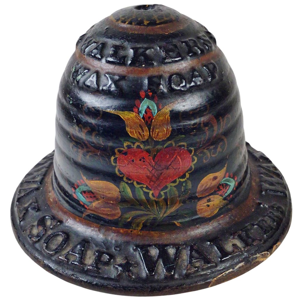 Cast iron beehive-form countertop twine dispenser with embossed advertising for Walker's Wax Soap and handpainted floral detail, ca. 1880s.